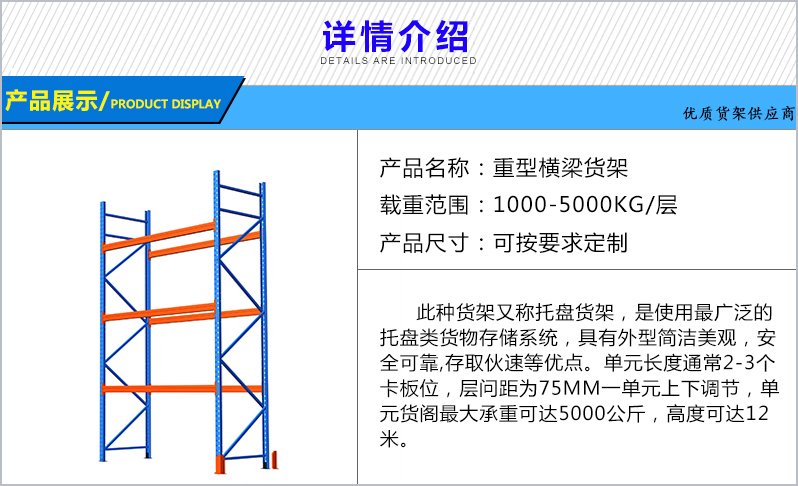 重型貨架,又俗稱橫梁式貨架,或稱貨位式貨架,屬于托盤貨架類,在國內(nèi)的各種倉儲貨架系統(tǒng)中為常見一種貨架形式。以立柱片+橫梁形式的全組裝結(jié)構(gòu),結(jié)構(gòu)簡明有效?筛鶕(jù)存儲單元集裝設(shè)備的特性加裝如:隔檔、鋼層板(鋼格板)、金屬絲網(wǎng)層、倉儲籠導(dǎo)軌、油桶架等功能性附件,能夠滿足不同單元集裝設(shè)備形式的貨物存儲。